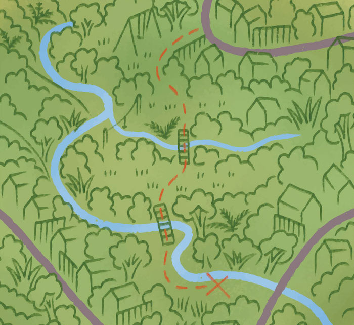 Follow sealed track past the playground and flying fox to the bridge through the bush. Head down the steps to cross the bridge. Keep following the track to the next steps and bridge and cross that too. Continue following the path until you see the outdoor classroom sign for Mamakū on your left above a big waterway culvert. Being careful not to let anyone get too close to this sharp drop off, head off track here through the trees. You will see a rough path heading towards the right, follow this until you come to a small clearing beneath Kahikatea trees. The hut sits facing the stream somewhere to your left.